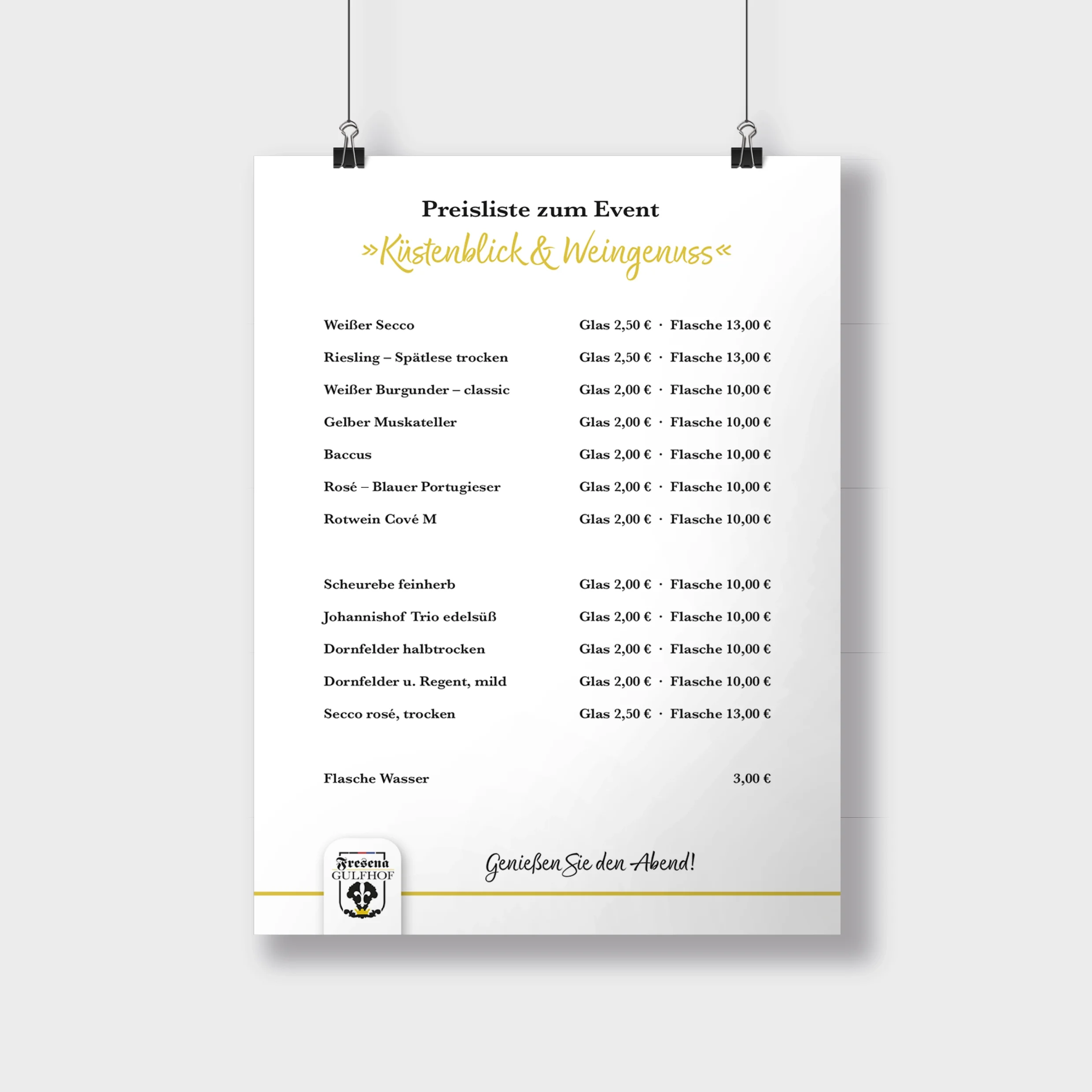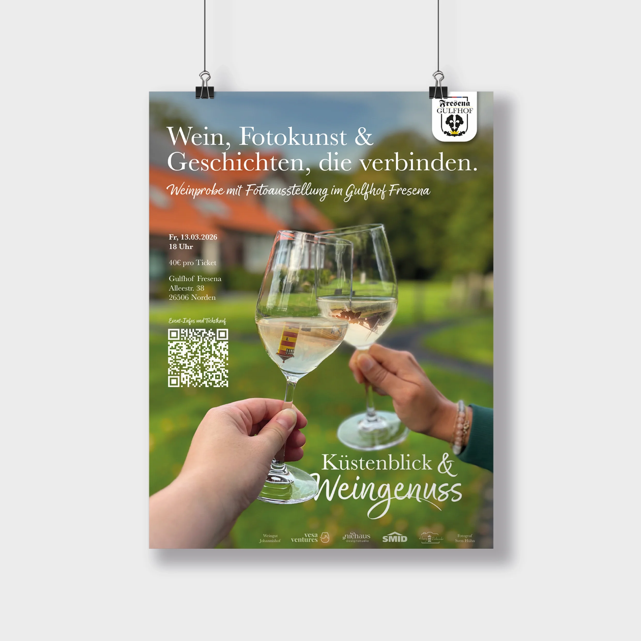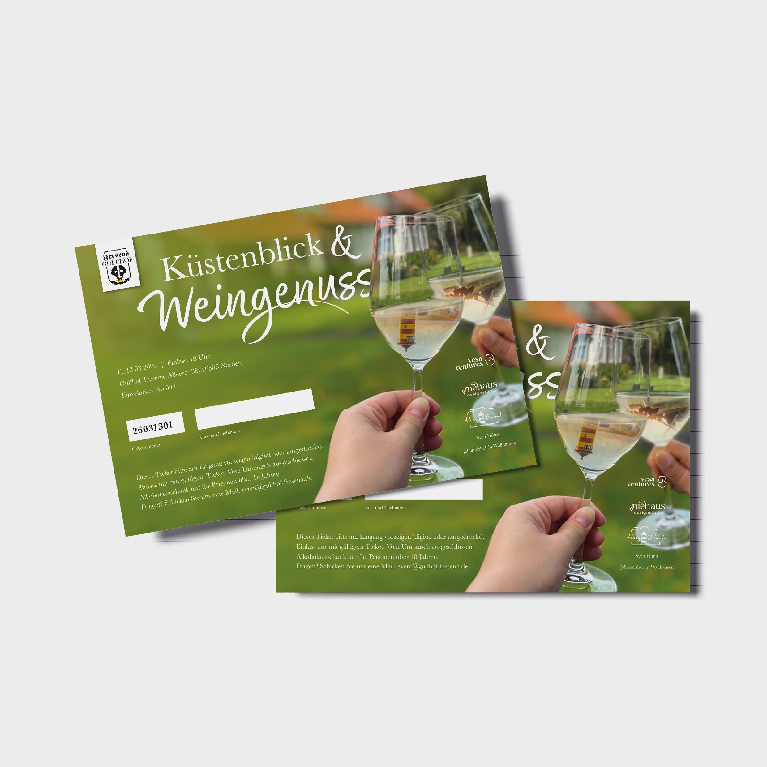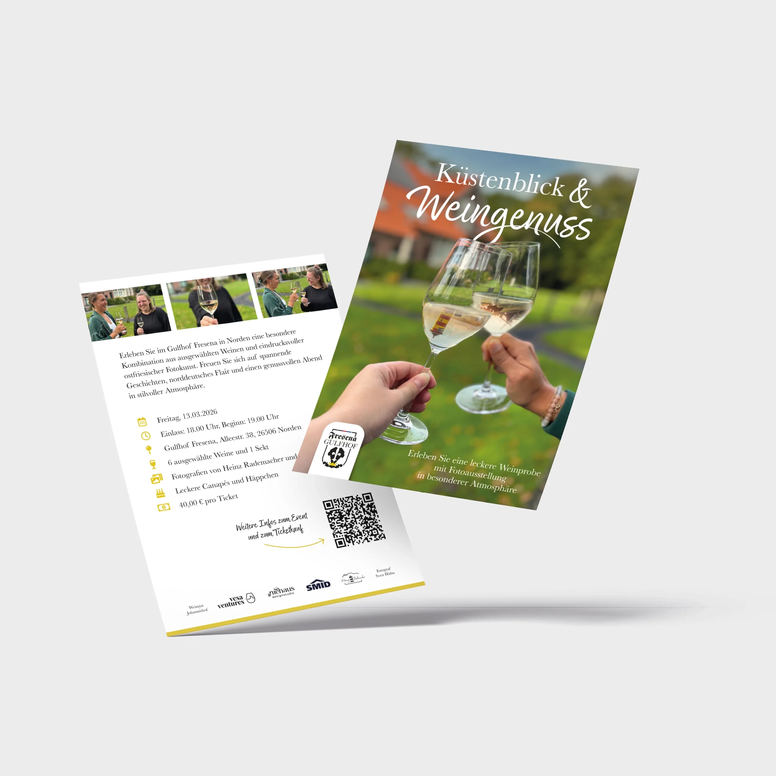 Für das Event »Küstenblick & Weingenuss« beim Gulfhof Fresena in Norden habe ich ein ganzheitliches Gestaltungskonzept entwickelt, das Atmosphäre, Genuss und Ort visuell miteinander verbindet. Ziel war es, ein einheitliches Erlebnis zu schaffen – vom ersten Eindruck bis zum Event vor Ort.