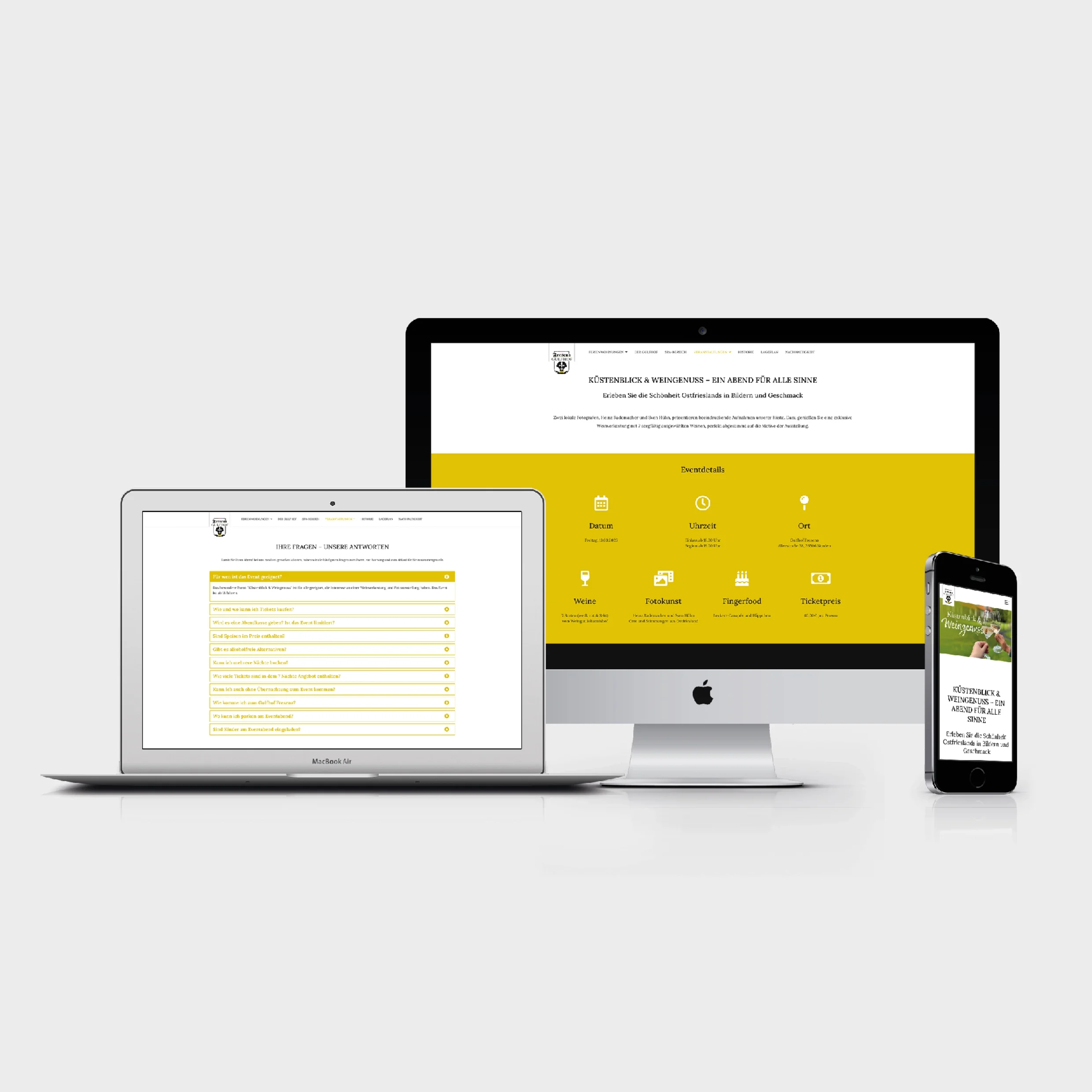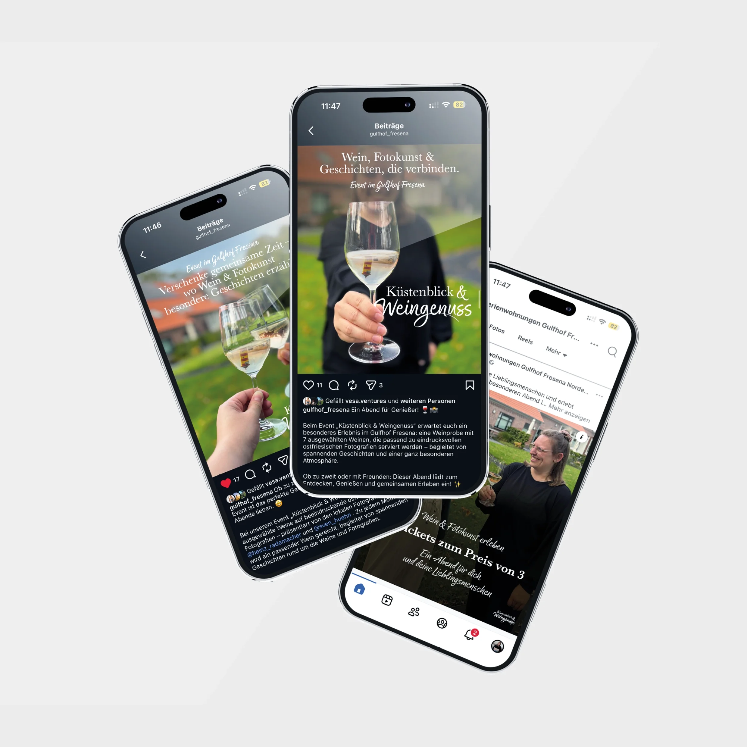 Zentrales Element war das Keyvisual: In einem Bild habe ich den Veranstaltungsort (Gulfhof Fresena), die Weinprobe (durchgeführt von Weingut Johannishof Lunkenheimer) und die Fotoausstellung (mit großartigen Bildmotiven der Fotografen Heinz Rademacher und Sven Hühn) miteinander kombiniert, sodass das Konzept des Events auf einen Blick erlebbar wurde. Darauf aufbauend habe ich sämtliche Medien gestaltet – von der Event-Landingpage, Grafiken für die Ferienwohnungsseiten und Social Media bis hin zu Printprodukten wie Flyer, Plakate, Tickets und die Broschüre. Auch die Organisation, Planung und Durchführung des Events habe ich begleitet.