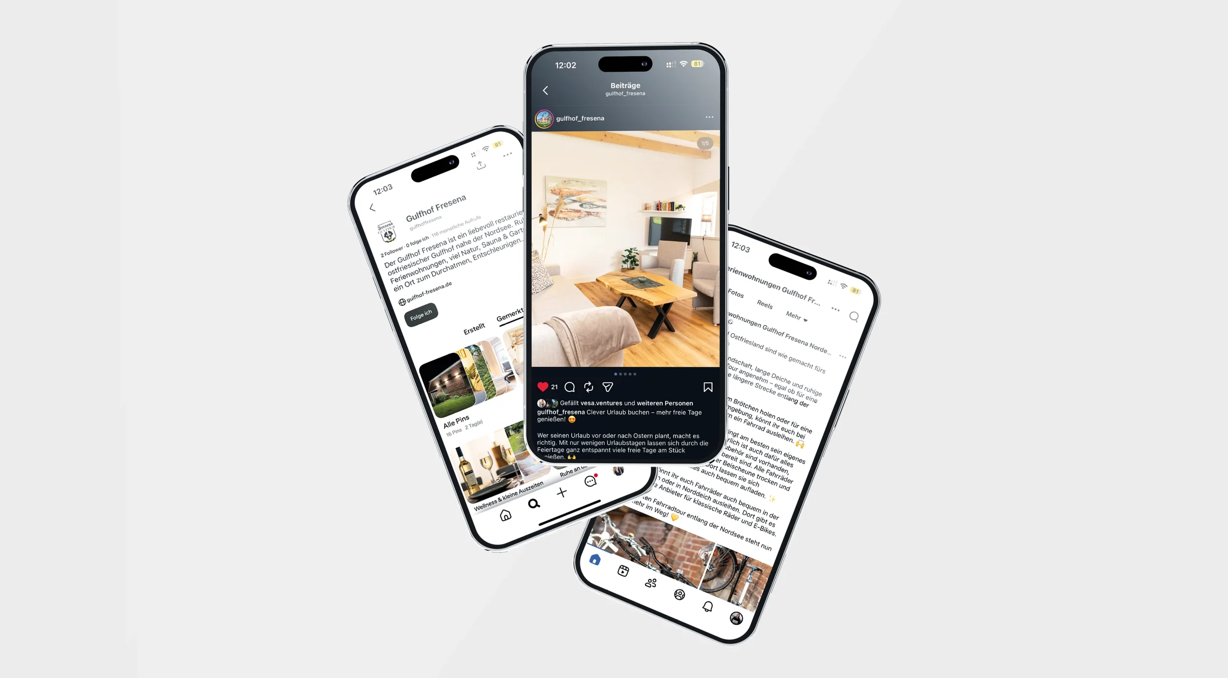 Für den Gulfhof Fresena betreue ich den Social-Media-Auftritt ganzheitlich – von der Ideenentwicklung bis zur Veröffentlichung. Ziel ist es, die besondere Atmosphäre des Gulfhofs auch digital erlebbar zu machen und eine klare, wiedererkennbare Linie zu schaffen.