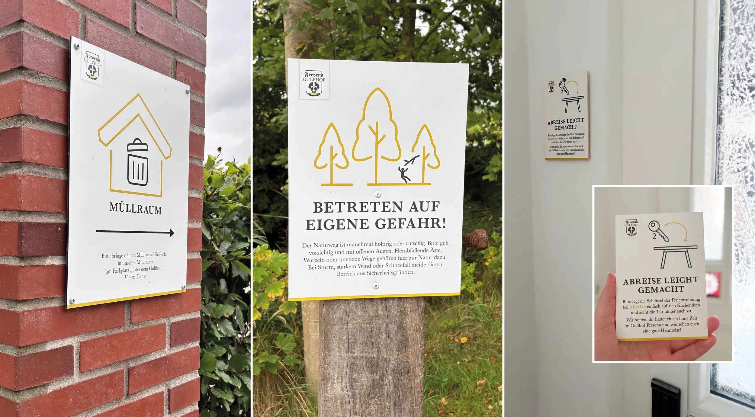 Die Beschilderung im Gulfhof Fresena sorgt für klare Orientierung und fügt sich gleichzeitig in das Gesamtbild des Gulfhofes ein.